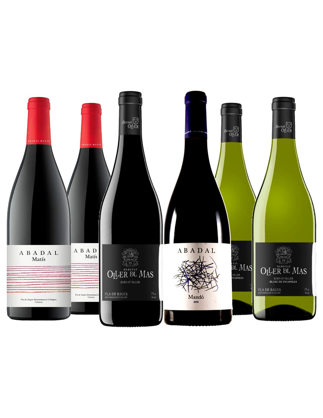 De Oller del Mas os presentamos su vino más representativo, el Bernat Oller, en sus versiones de tinto y blanco. La selección contiene una botella de tinto y dos de blanco. El Bernat Oller 2017 es un coupage de Merlot, Shiraz y Picapoll tinto madurado en barrica de roble durante quince meses. Es un vino elegante, con buena fruta y bien equilibrado que puede guardarse un tiempo. La producción fue de unas 27.000 botellas. El otro es el Bernat Oller Blanc de Picapolls que combina picapoll blanco y picapoll tinto (vinificado en blanco), ambas variedades autóctonas de Pla de Bages. Criado sobre sus lías, una parte del vino, alrededor del 10% también experimenta un paso por barrica lo que ayuda a remarcar su consistencia. En cualquier caso es un vino fresco, suave y de cuerpo medio que llena la boca con sensaciones delicadas. Producción limitada a 9.600 botellas