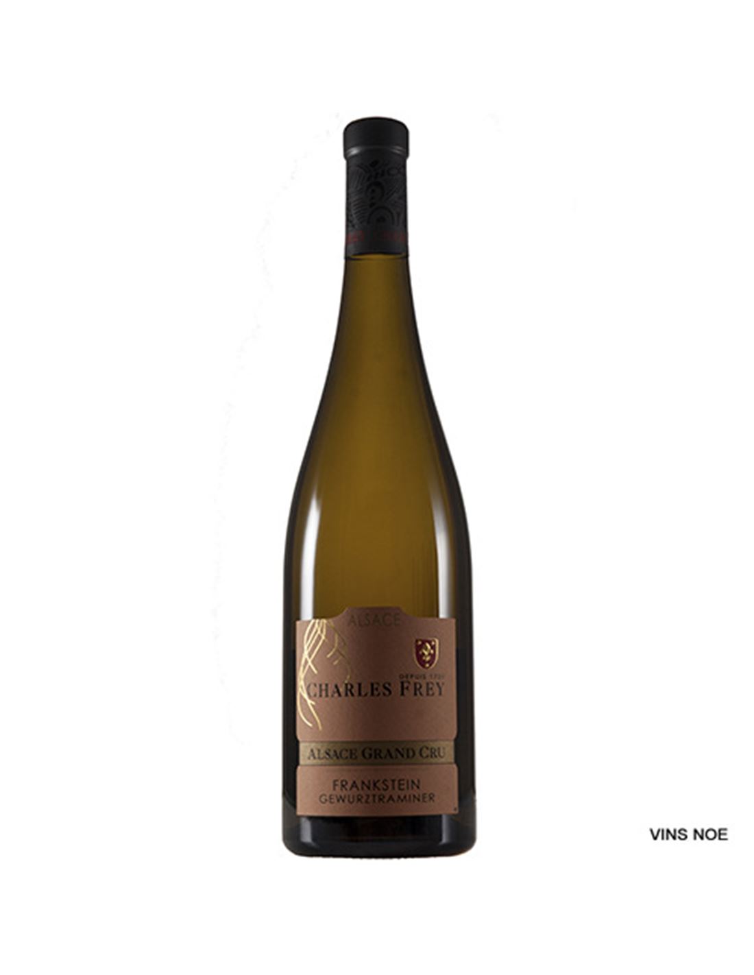 Charles Frey Gewurztraminer Grand Cru Frankstein es un vino de una bodega familiar situada en el corazón de Alsacia que desde 2001 apostó por la agricultura biodinámica en sus 13 Ha. de viñedo propio. Este vino proviene de un viñedo calificado como Grand Cru. El vino, 100% varietal, tras la fermentación experimenta una crianza sobre sus propias lías de 10 meses en tinas. Vino aromático, floral y afrutado a la vez, es amoroso gracias a su contenido de azúcar residual de 38,6 gramos por litro. Se puede mantener en botella hasta 15 años desde la fecha de la cosecha. Producción limitada a 3.000 botellas