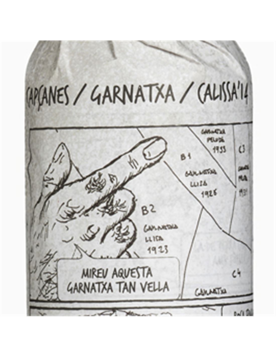 "La nit de las garnatxes" Calissa es un vino tinto del Montsant elaborado al 100% con garnacha tinta procedentes de viñas plantadas sobre terrenos de piedra caliza fragmentada, la típica geología arisca de nuestro país. Es un vino fermentado en tino de roble de 500 litros y envejecido en barrica de roble francés durante seis meses de caràcter agreste y franco que destila a la vez una vivacidad y frescura que contrastan con la calidez que le aporta el terreno. En cualquier caso, es un vino muy diferente de sus hermanos de colección.